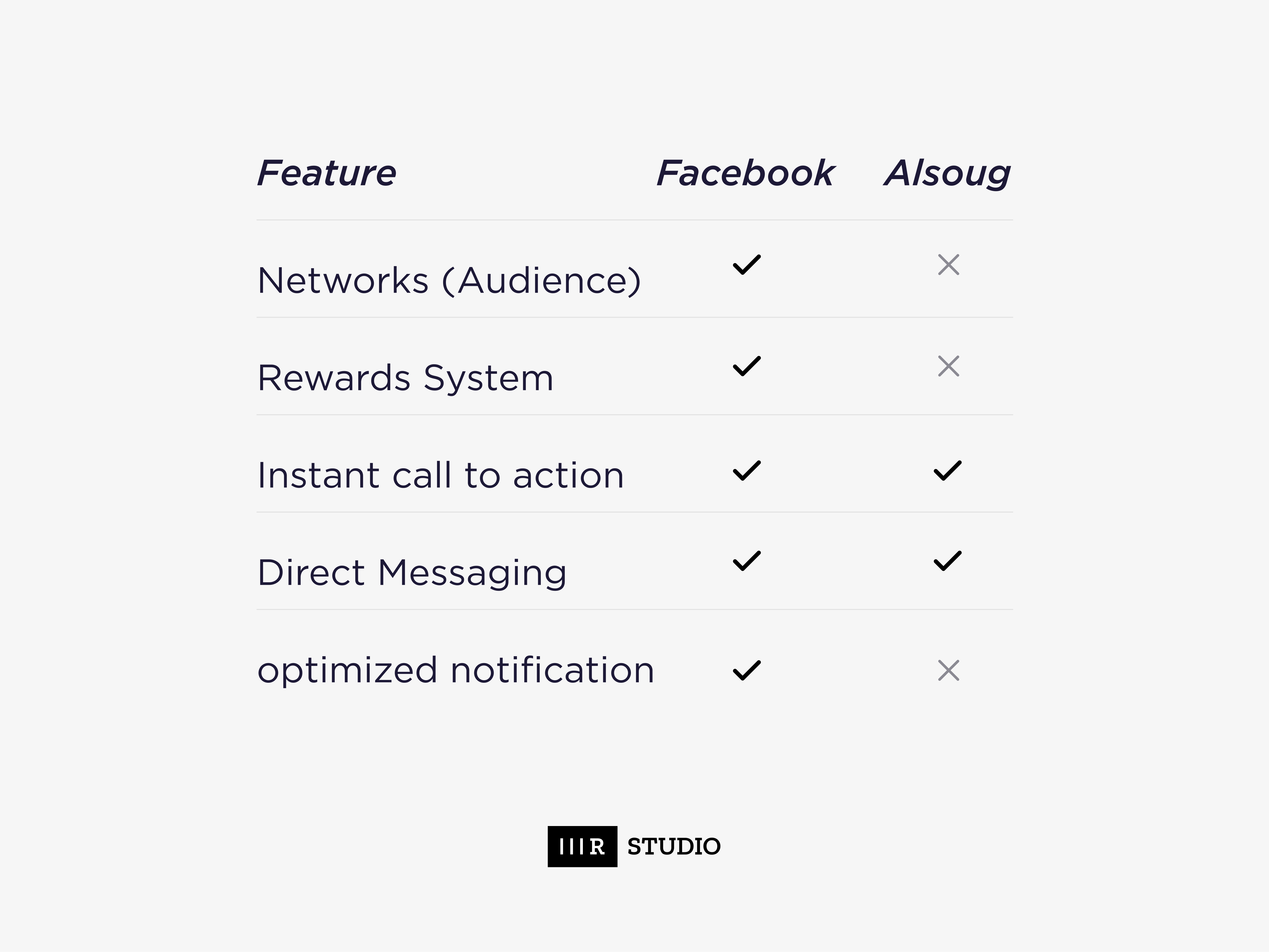 Clearly, we are talking about in-app features. As we compare in the next table the difference between Alsoug.com and Facebook.